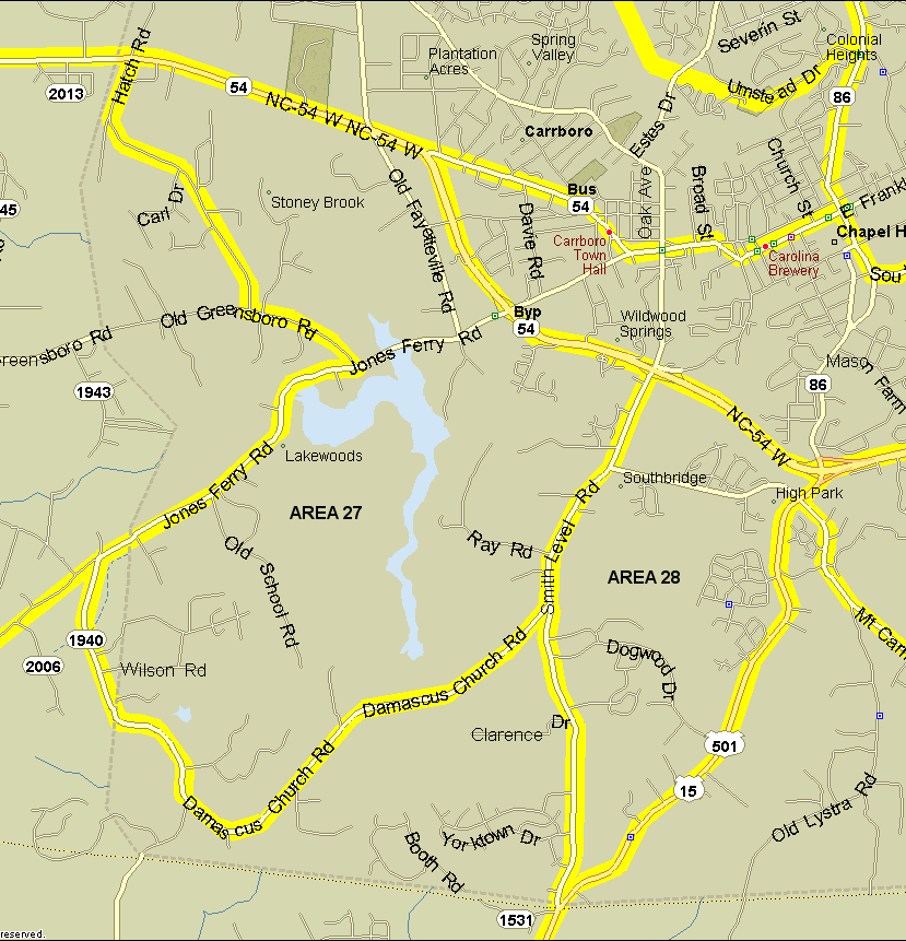 27. University Lake area. Bounded on northeast by NC 54 and 54 bypass from Hatch Rd. (1944) to Smith Level Road, on southeast by Smith Level Rd./Damascus Church Road (SR 1939/SR 1940), on west by Jones Ferry Rd./Greensboro Hwy/Hatch Rd. (SR 1944). Excludes the latter three roads. Notes: See University Lake for more information on covering the lake.