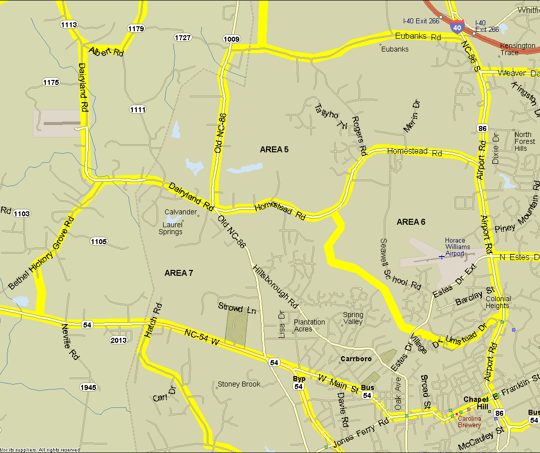 7. Carrboro area. Bounded on south by Business 54 (Franklin/Main Sts.) from Columbia St. to SR 1104 (Bethel-Hickory Grove Ch. Rd.); north by SR 1104 from 54 to Calvander, then Homestead Rd. from Calvander to Bolin Creek, then Bolin Creek; east by Airport Rd. from Bolin Creek to Franklin St. Does not count either side of Bolin Creek, Bethel-Hickory Grove Church Rd., or Dairyland Rd. Notes: